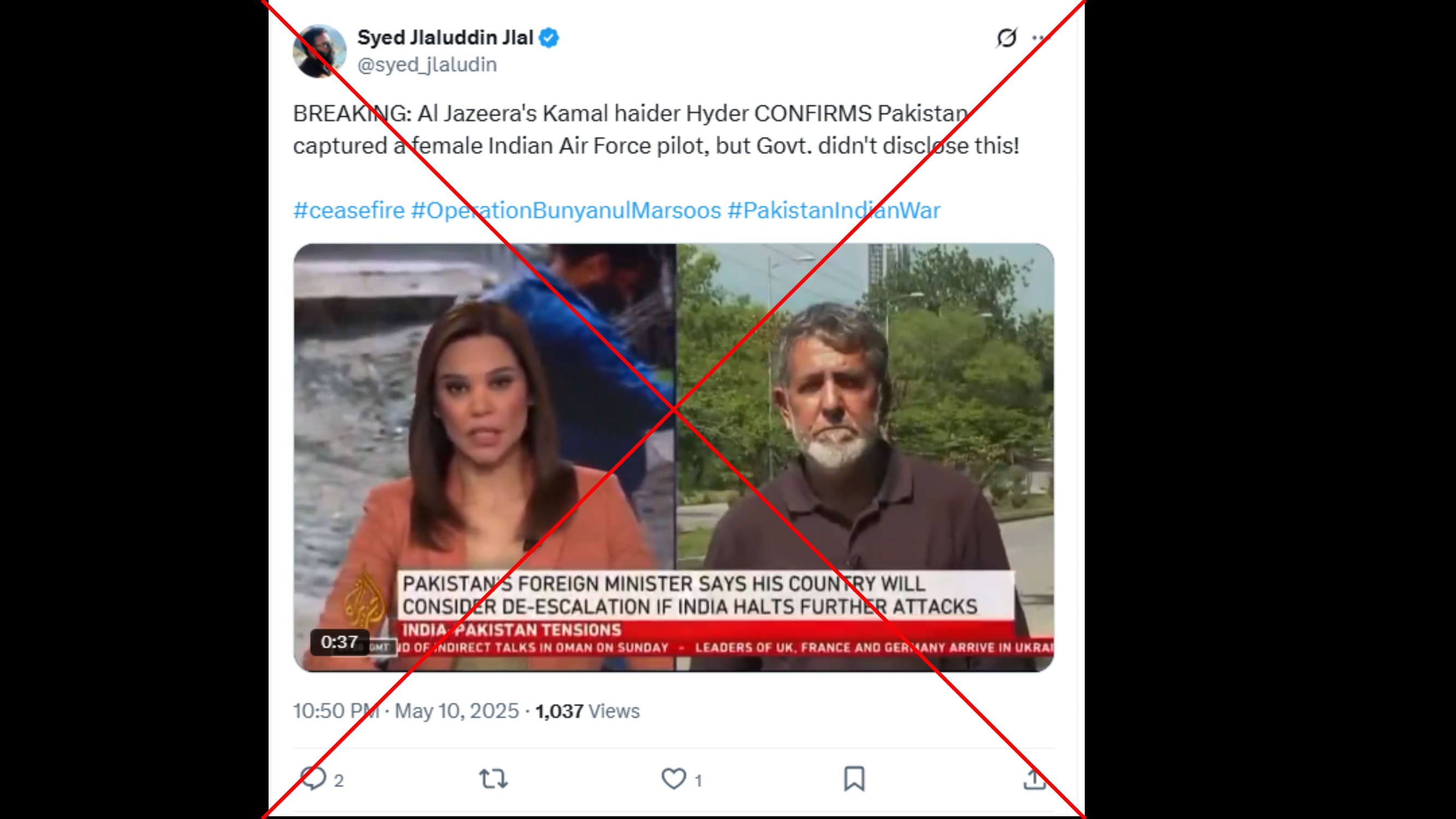 अल जजीरा के रिपोर्टर कमाल हैदर ने इस्लामाबाद से रिपोर्टिंग करते हुए यह दावा किया था कि पाकिस्तान ने एक भारतीय महिला फाइटर पायलट को पकड़ लिया है। पाकिस्तान की सरकार का हवाला देते हुए बताया गया था कि पाकिस्तान ने दो फाइटर जेट को गिरा दिया है और एक महिला फाइटर पायलट को पकड़ लिया है।