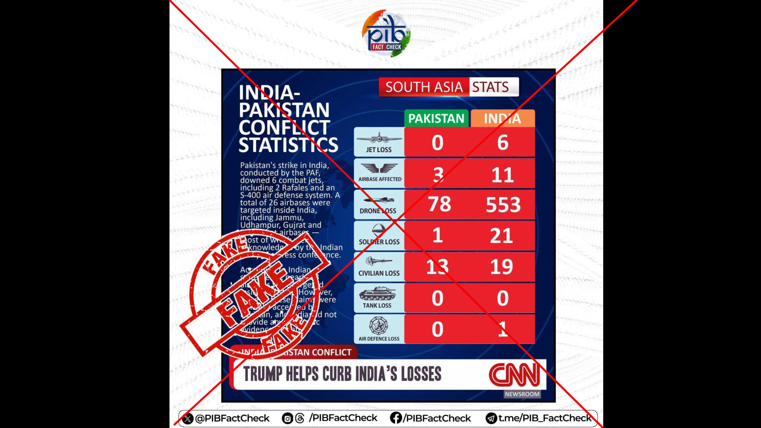 सीएनएन के नाम से एक ग्राफिक शेयर किया जा रहा है, जिसमें पाकिस्तान और भारत को लड़ाई में हुए नुकसान का डाटा दिया गया है। इसमें जेट, एयरबेस, ड्रोन, सैनिक, नागरिक, टैंक, वायु नुकसान के बारे में जानकारी दी गई है। इसमें भारत को ज्यादा नुकसान होता हुआ नजर आ रहा है।