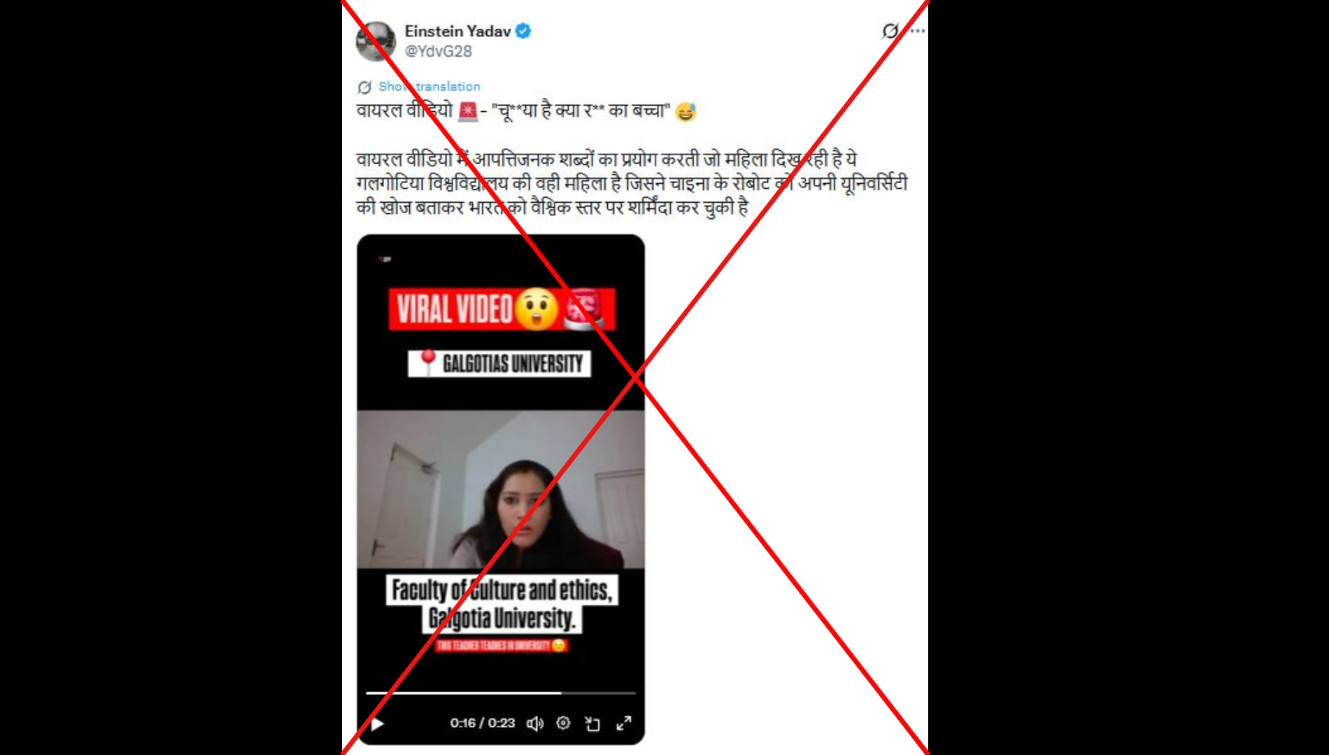 आइंस्टीन यादव (@YdvG28) नाम के एक्स यूजर ने लिखा,” वायरल वीडियो – “चू**या है क्या र** का बच्चा” वायरल वीडियो में आपत्तिजनक शब्दों का प्रयोग करती जो महिला दिख रही है ये गलगोटिया विश्वविद्यालय की वही महिला है जिसने चाइना के रोबोट को अपनी यूनिवर्सिटी की खोज बताकर भारत को वैश्विक स्तर पर शर्मिंदा कर चुकी है।” पोस्ट का लिंक आप यहां और आर्काइव लिंक यहां देख सकते हैं।