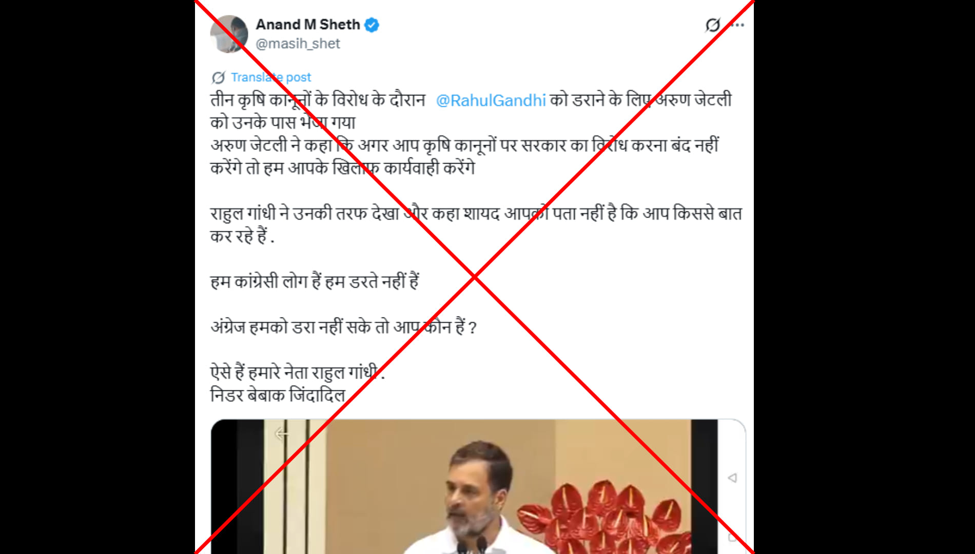 आनंद एम शेठ (@masih_shet) नाम के एक्स यूजर ने राहुल गांधी का वीडियो शेयर कर राहुल के भाषण के आधार पर लिखा “तीन कृषि कानूनों के विरोध के दौरान राहुल गांधी को डराने के लिए अरुण जेटली को उनके पास भेजा गया। अरुण जेटली ने कहा कि अगर आप कृषि कानूनों पर सरकार का विरोध करना बंद नहीं करेंगे तो हम आपके खिलाफ कार्रवाई करेंगे। राहुल गांधी ने उनकी तरफ देखा और कहा शायद आपको पता नहीं है कि आप किससे बात कर रहे हैं। हम कांग्रेसी लोग हैं हम डरते नहीं हैं अंग्रेज हमको डरा नहीं सके तो आप कौन हैं ? ऐसे हैं हमारे नेता राहुल गांधी निडर बेबाक जिंदादिल हैं।” पोस्ट का लिंक आप यहां और आर्काइव लिंक यहां देख सकते हैं।