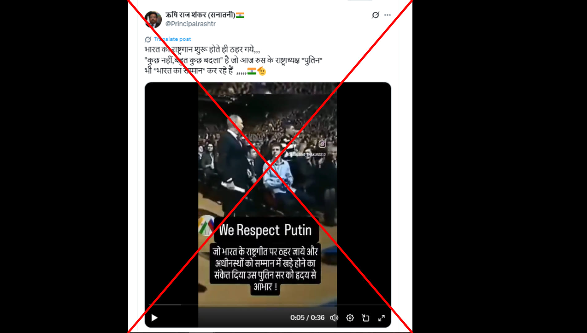 सोशल मीडिया पर एक वीडियो शेयर कर दावाा किया जा रहा है कि रूसी राष्ट्रपति पुतिन ने भारतीय राष्ट्रगान के सम्मान में खड़े हैं।