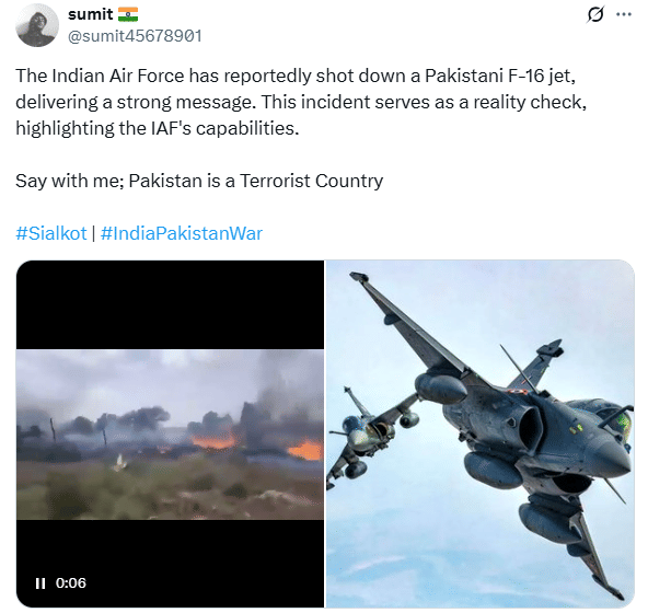 दूसरा दावा भारत द्वारा पाकिस्तान के लड़कू विमान को गिराने का किया जा रहा है। सुमित (@sumit45678901) नाम के एक एक्स यूजर ने लिखा “भारतीय वायुसेना ने कथित तौर पर एक पाकिस्तानी एफ-16 जेट को मार गिराया है, जो एक कड़ा संदेश है। यह घटना एक वास्तविकता की जाँच के रूप में कार्य करती है, जो भारतीय वायुसेना की क्षमताओं को उजागर करती है।” इस दावे का लिंक और आर्काइव लिंक आप यहां और यहां देख सकते हैं।