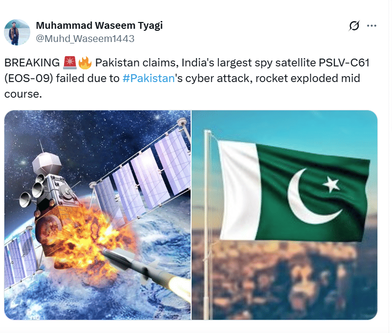 सोशल मीडिया पर तस्वीर शेयर कर दावा किया जा रहा है कि भारत का पीएसएलवी-सी 61 मिशन पाकिस्तान के साइबर हमले की वजह से फेल हो गया है।