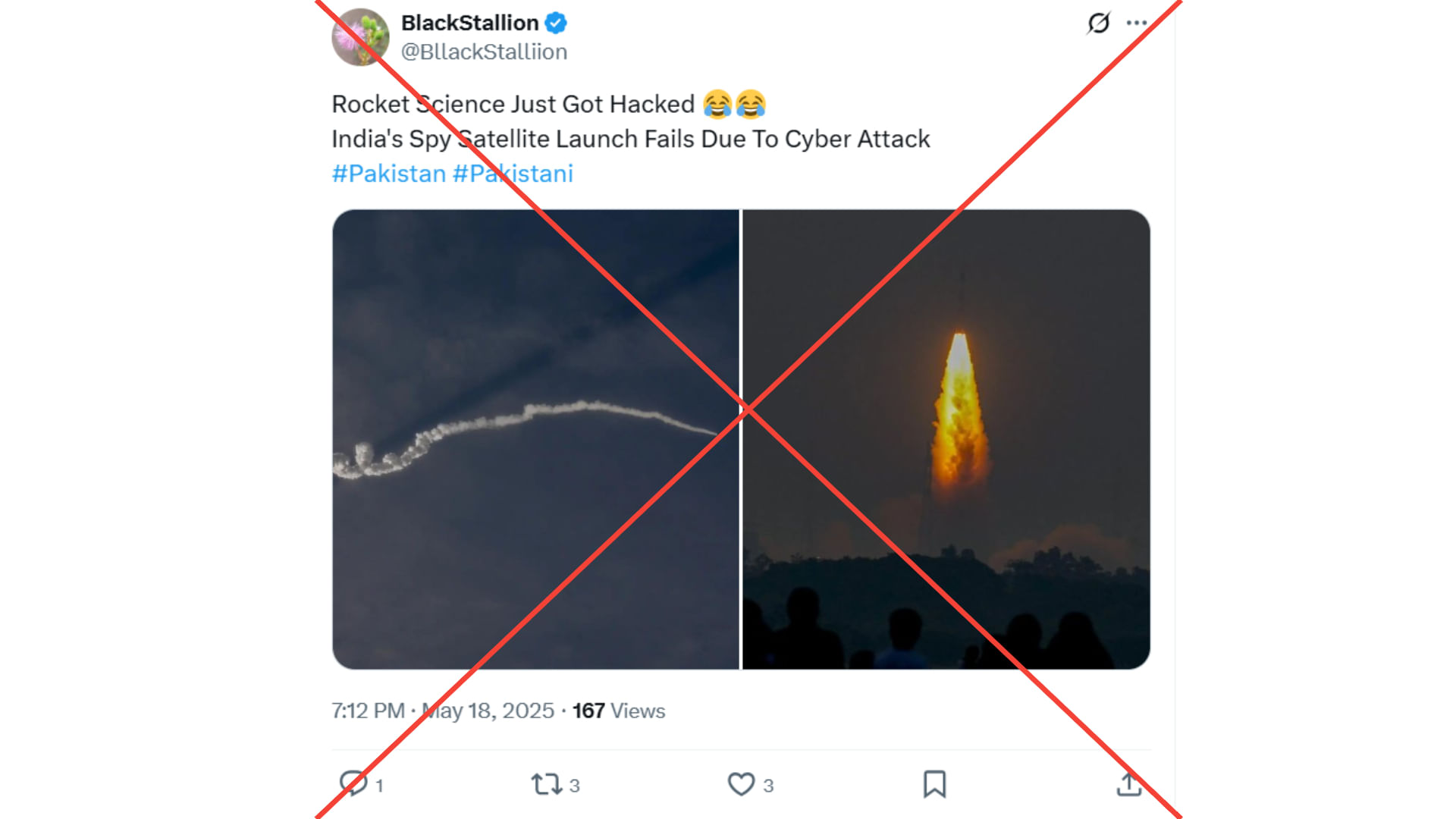 ब्लैक स्टैलियन (@ब्लैकस्टैलियन) नाम के एक एक्स यूजर ने तस्वीर को शेयर कर लिखा, “रॉकेट साइंस को हैक कर लिया गया, साइबर हमले के कारण भारत का जासूसी उपग्रह प्रक्षेपण विफल।” इसके साथ ही पाकिस्तान और पाकिस्तानी हैशटैग का इस्तेमाल किया गया है। दावे की लिंक आप यहां और आर्काइव लिंक यहां देख सकते हैं।