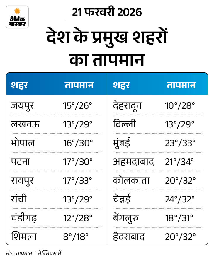 MP में आज से खिलेगी धूप: राजस्थान में तापमान 30° पार; हरियाणा की रातें सर्द, उत्तराखंड में 22 फरवरी से बारिश-बर्फबारी का अलर्ट