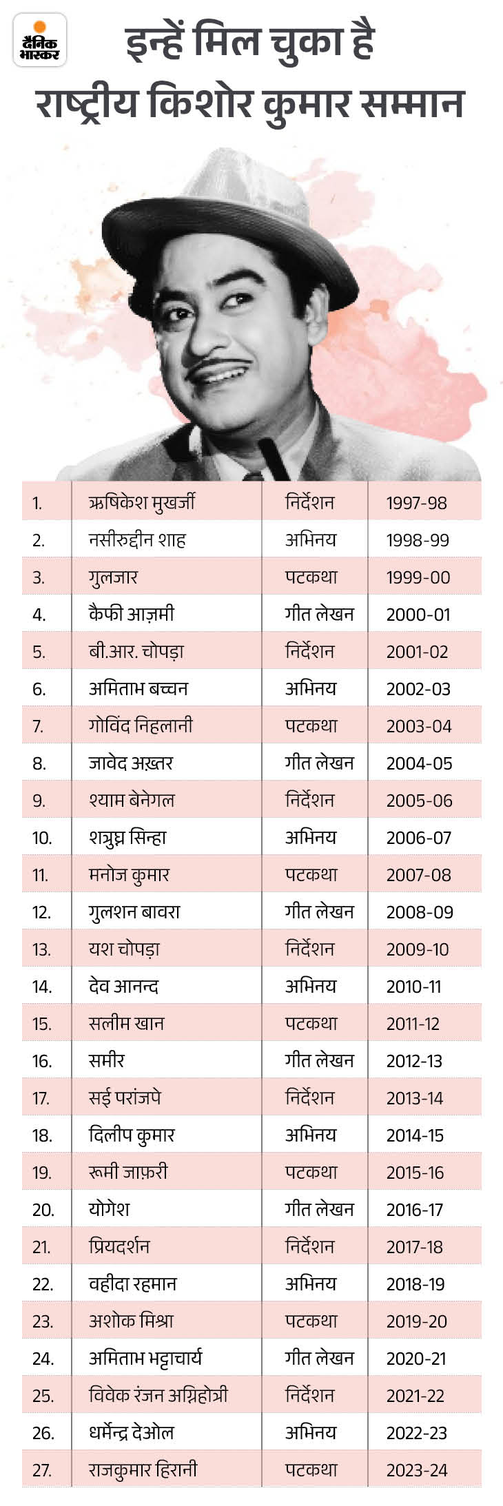 निर्देशक ऋषिकेश मुखर्जी को मिला था पहला सम्मान 1997 से अब तक फिल्म जगत से जुड़े कई सितारों-कलाकारों को यह सम्मान दिया जा चुका है। पहले सम्मान जाने-माने निर्देश ऋषिकेश मुखर्जी को 1997 में मिला था। साल 2024-25 का किशोर कुमार सम्मान गीतकार प्रसून जोशी को दिया जा रहा है। पिछले साल ये पुरस्कार निर्देश राजकुमार हिरानी को मिला था।