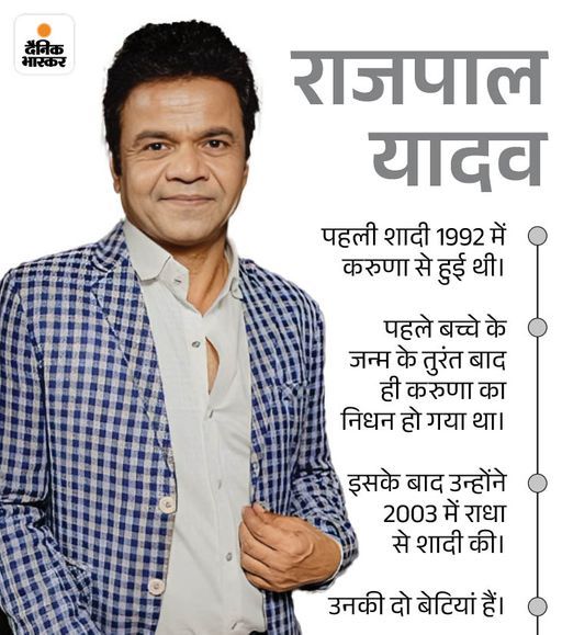 बेटी के जन्म के 15 मिनट बाद पत्नी का निधन एक इंटरव्यू में राजपाल यादव ने बताया कि वे 20 साल के थे जब घरवालों के दबाव में उनकी शादी कराई गई। उनकी पहली पत्नी का नाम करुणा था। एक साल बाद बेटी ज्योति का जन्म हुआ, लेकिन डिलीवरी के 15 मिनट बाद ही उनकी पत्नी का निधन हो गया।