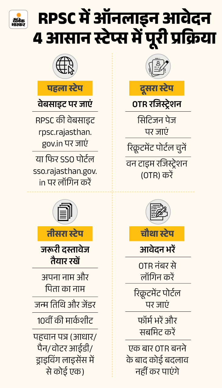 आयोग सचिव रामनिवास मेहता ने बताया कि उक्त पदों के लिए ऑनलाइन आवेदन 24 दिसंबर से 22 जनवरी 2026 की रात्रि 12 बजे तक किए जा सकेंगे। ऑफलाइन आवेदन स्वीकार नहीं किए जाएंगे। परीक्षा तिथि व स्थान के संबंध में यथासमय सूचित कर दिया जाएगा।