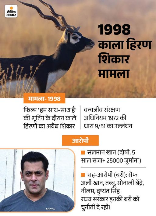 मामला सितंबर-अक्टूबर 1998 का है, जब फिल्म ‘हम साथ साथ हैं’ की शूटिंग के दौरान कांकाणी गांव की सरहद पर दो काले हिरणों का शिकार किया गया था। निचली अदालत ने सलमान खान को दोषी मानते हुए 5 साल के कारावास और 25 हजार रुपए के जुर्माने से दंडित किया था।