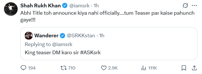 फैंस ने उनसे फिल्म को लेकर कई सवाल पूछे, लेकिन SRK ने हमेशा की तरह हर बात को मजाकिया अंदाज में टाल दिया। जब एक फैन ने लिखा – “सर, किंग का टीजर डीएम करो!” तो शाहरुख ने जवाब दिया – “अभी टाइटल तो अनाउंस किया नहीं… तुम टीजर पर कैसे पहुंच गए!”