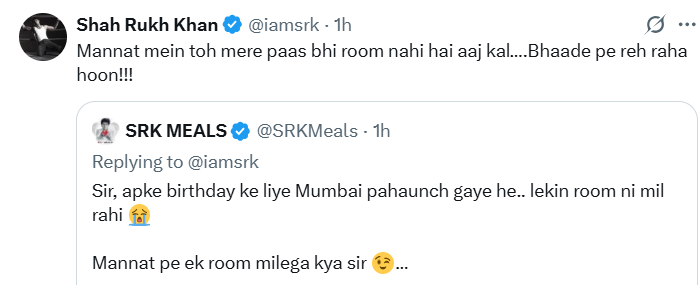जब एक यूजर ने कहा कि वह एक्टर के बर्थडे के लिए मुंबई आ गया है, लेकिन उसे यहां कमरा नहीं मिल रहा, तो उसने मजाक में पूछा – “क्या मन्नत में एक कमरा मिल सकता है?”जिस पर SRK ने मजेदार जवाब दिया – “मन्नत में तो मेरे पास भी रूम नहीं है आजकल… भाड़े पर रह रहा हूं!!!”