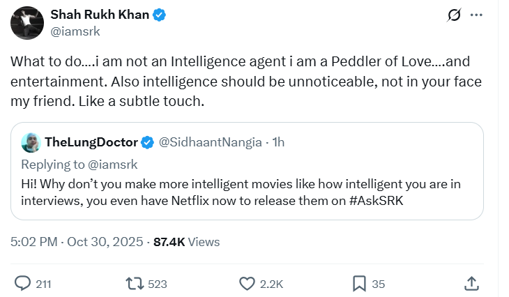 इस पर शाहरुख ने अपने स्टाइल में जवाब दिया – “क्या करें… मैं कोई इंटेलिजेंस एजेंट नहीं हूं। मैं तो प्यार और मनोरंजन का व्यापारी हूं। और इंटेलिजेंस को ज्यादा दिखाना नहीं चाहिए, वो एक हल्के स्पर्श की तरह होनी चाहिए, न कि सामने से मारती हुई।”
