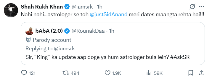 एक फैन ने उनसे पूछा – “सर, ‘किंग’ का अपडेट आप देंगे या हम ज्योतिषी बुला लें?” इस पर शाहरुख ने जवाब दिया — “नहीं नहीं… ज्योतिषी से तो सिद्धार्थ आनंद मेरी डेट्स मांगता रहता है!!!”