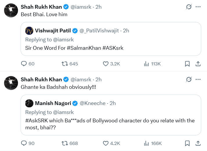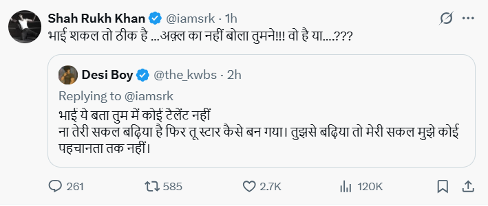 एक यूजर ने कहा – “भाई, ये बता – तुझमें कोई टैलेंट नहीं, न तेरी शक्ल बढ़िया है, फिर तू स्टार कैसे बन गया? तुझसे बढ़िया तो मेरी शक्ल है, मुझे तो कोई पहचानता तक नहीं!” तो शाहरुख ने अपने खास अंदाज में लिखा – “भाई शक्ल तो ठीक है… अक्ल का नहीं बोला तुमने!!! वो है या…???”