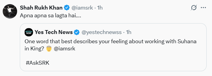 एक अन्य फैन ने पूछा – “सर, किंग में सुहाना के साथ काम करने के लिए एक शब्द क्या होगा?” इस पर शाहरुख ने जवाब दिया – “अपना-अपना सा लगता है…”