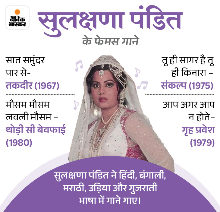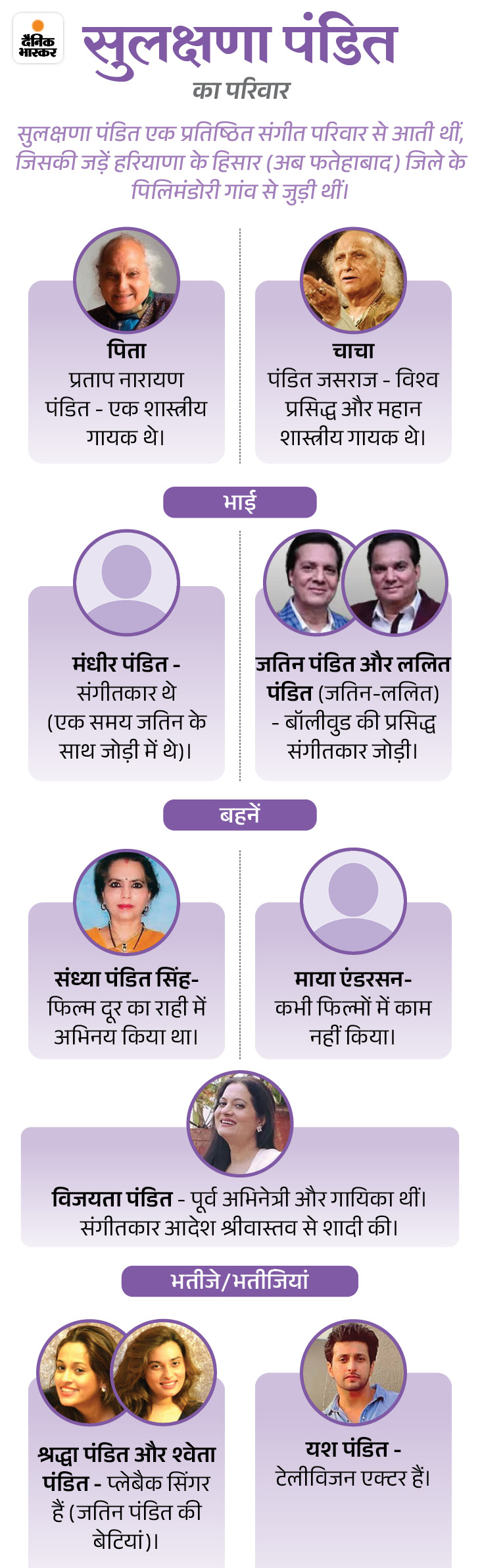 9 साल की उम्र में गाना शुरू कर दिया था सुलक्षणा पंडित का जन्म 12 जुलाई 1954 को हुआ था। वे एक संगीत से जुड़े परिवार से थीं। उनके चाचा महान शास्त्रीय गायक पंडित जसराज थे। उनके तीन भाई और तीन बहनें थीं। भाइयों में जतिन और ललित मशहूर म्यूजिक डायरेक्टर हैं। वहीं, उनकी बहन विजयता पंडित अभिनेत्री और पार्श्व गायिका रही हैं।